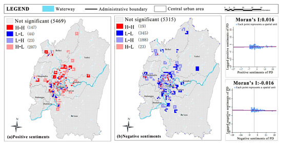 Spatial analysis results of local spatial autocorrelation for positive (a) and negative sentiments (b) in high PD areas.