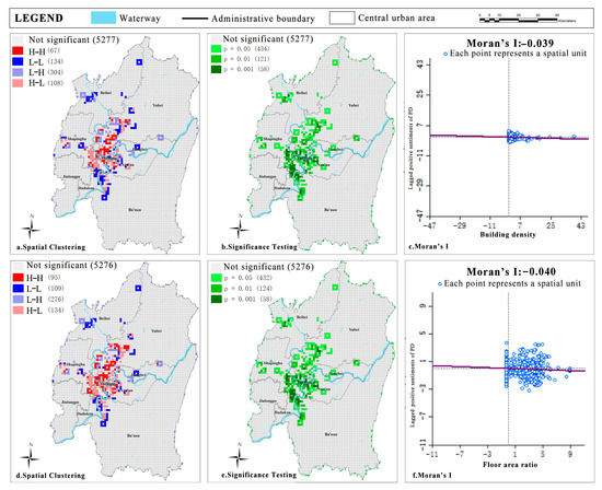 The bivariate local spatial autocorrelation analysis between positive sentiments in high PD areas and BD and FAR. (a). Distribution of local spatial autocorrelation between positive sentiments in high PD areas and BD; (b). Spatial distribution of significance between positive sentiments in high PD areas and BD; (c). Moran’s I of BD and lagged positive sentiments of PD; (d). Distribution of local spatial autocorrelation between positive sentiments in high PD areas and FAR; (e). Spatial distribution of significance between positive sentiments in high PD areas and FAR; (f). Moran’s I of FAR and lagged positive sentiments of PD. In (b,e), p < 0.05 means significant (95% confidence), p < 0.01 means highly significant (99% confidence), p < 0.001 means extremely significant (99.9% confidence).