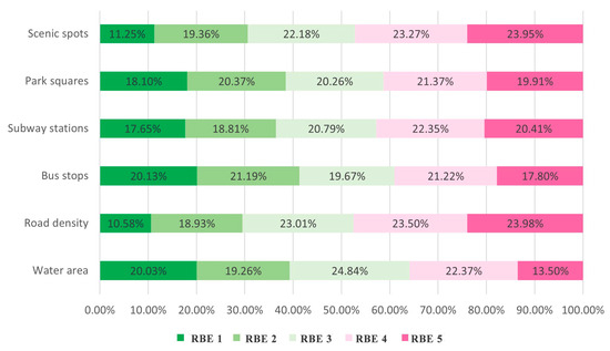 As Figure 5 illustrated, for each group of attributes, we retained as many available variables as possible while conducting variance inflation factor (VIF) tests and Pearson correlation analysis to study the multicollinearity problem. Variables with high collinearity (VIF > 10) were removed (Figure A1). It is worth noting that when two variables exhibit high collinearity, we retain the one that contains more comprehensive information or is in line with the interests of this study. For example, TEM, PRE, and RHU showed strong collinearity (Figure A2). We retained the former because the temperature caused by the mountainous thermal environment effect in Chongqing directly determines the feasibility and comfort of outdoor activities, thus significantly affecting people’s perception of spatial density.