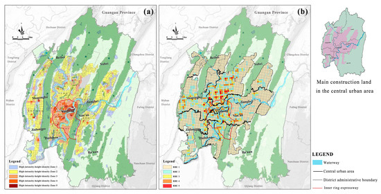 Chongqing’s urban area was mostly in Yuzhong District before the current city was built. The 2023 population of Chongqing was 31.9143 million, ranking first among China’s four direct-controlled municipalities [34]. As population grows and socioeconomic improvement continues, over 90% of Yuzhong District, the primary urban region, has a FAR of 5.0 or above [35]. However, many slowly developing suburbs on the fringes of the main urban region require policy improvements adapted to varied development demands. Regional studies like the one in the central urban area of Chongqing, a high-density city with worldwide natural environmental characteristics, are crucial.