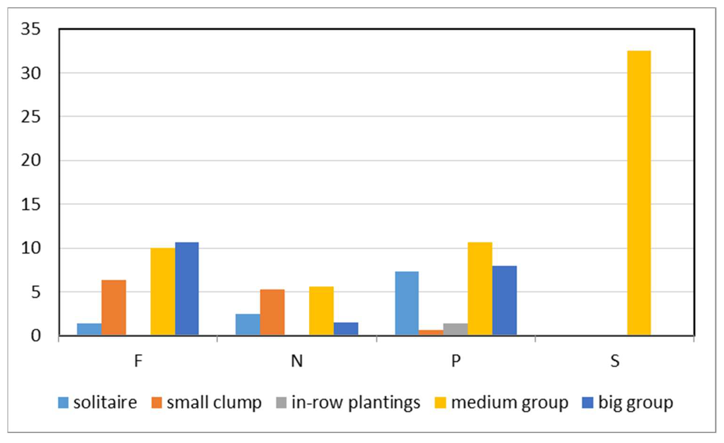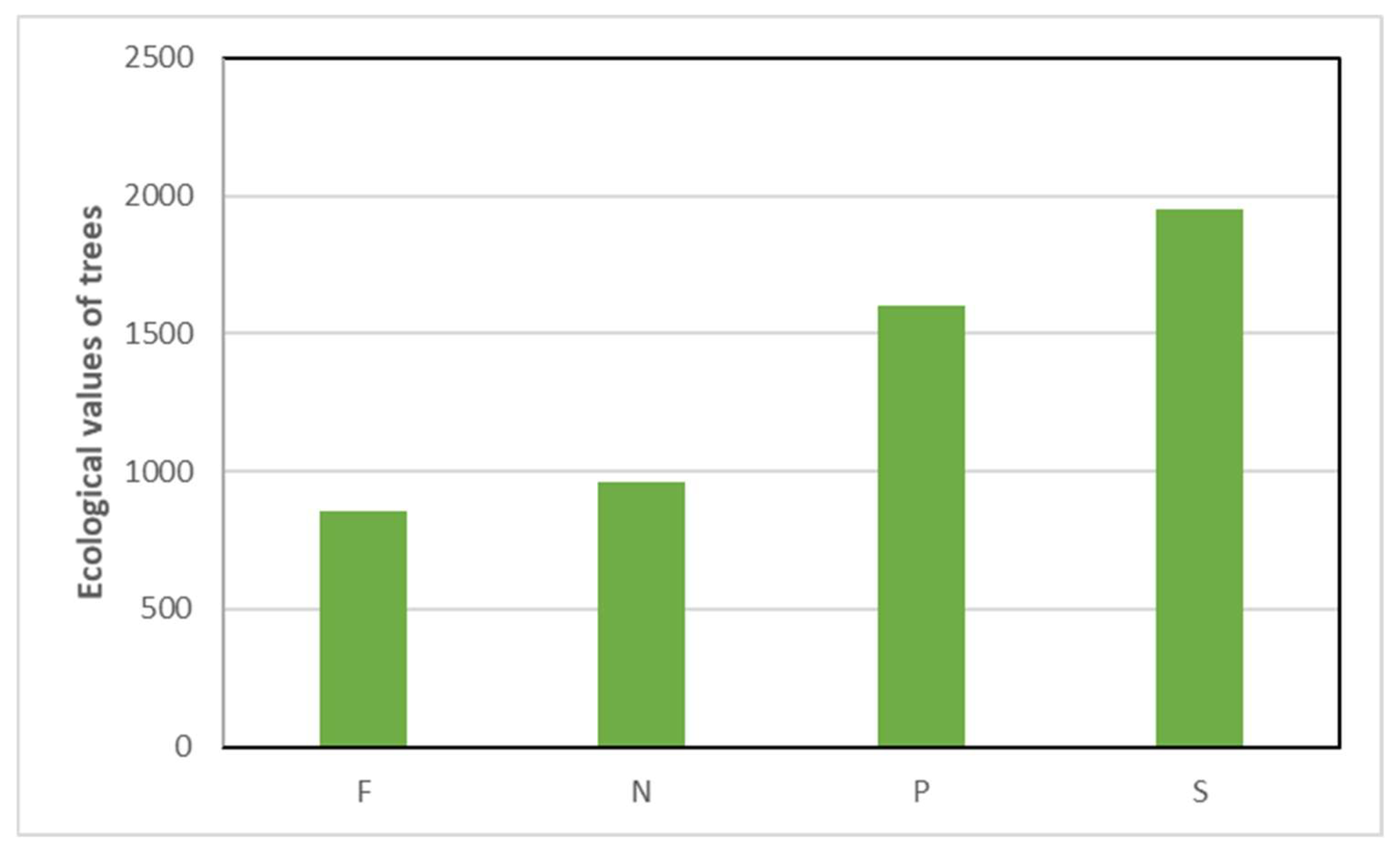 Figure 5). The highest ecological value was observed within the shooting range (S), where tree stands achieved the highest scores due to relatively high numbers of trees and favourable biocenotic characteristics. Areas along paths (P) ranked second in terms of ecological value, benefiting from both relatively dense tree cover and the presence of valuable native species contributing positively to ecosystem services.