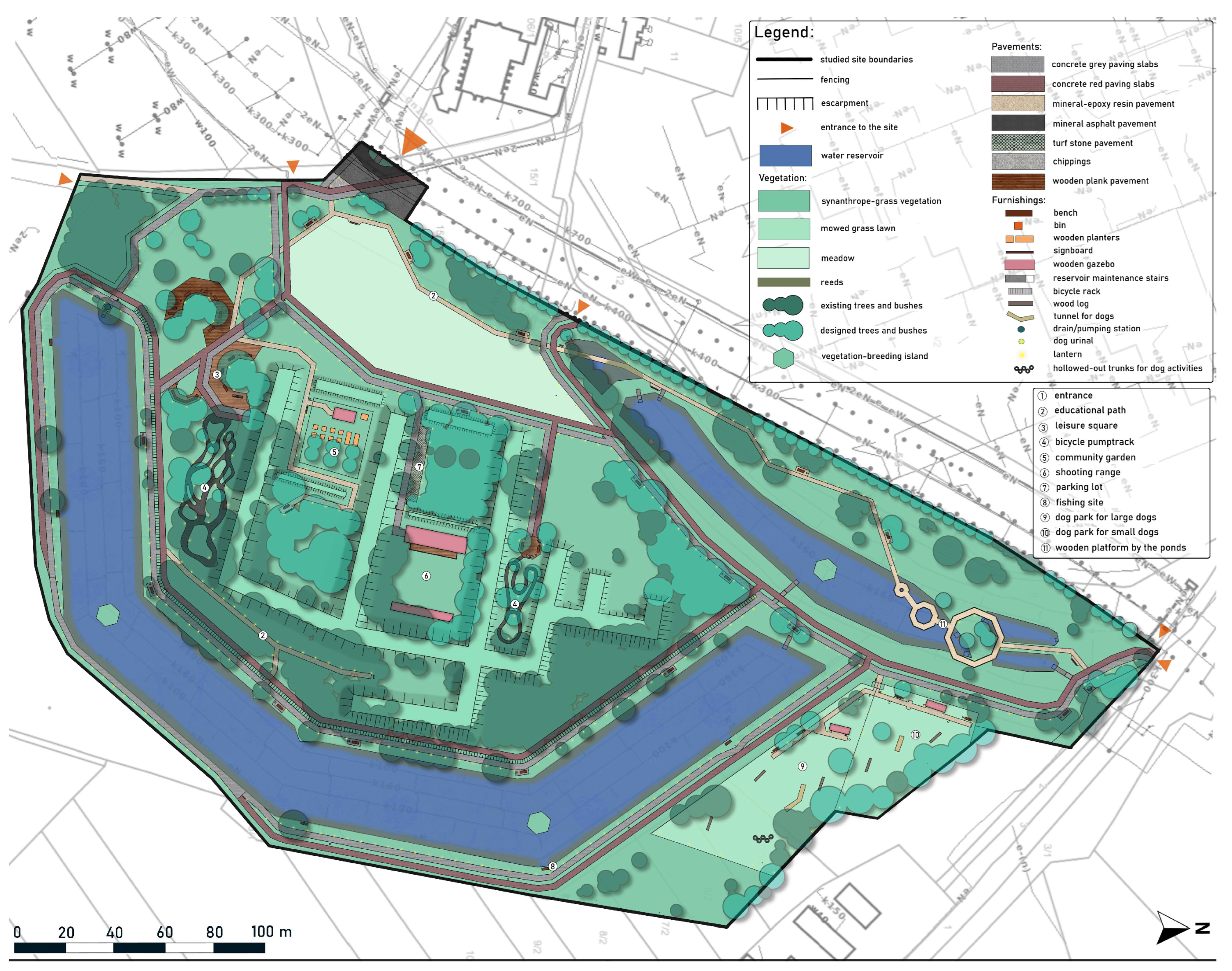 Fraxinus excelsior L.) will be planted to create some shade. Finally, a large-scale grassy area to the north of the moat will be adapted into a dog play area, separately for small and larger dogs. The entrance to the site will be protected by a double gate for safety purposes (avoiding potential escape of the dogs). Both paddocks will be equipped with wooden vertical elements (allowing dogs to urinate) and some obstacle courses in the form of logs and hollow tree trunks. Benches under the trees and gazebos (used in unfavourable weather conditions) will be placed for the owners.