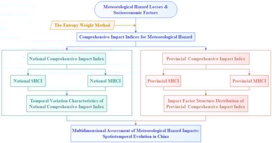 After collecting meteorological hazard losses data and socioeconomic data, the entropy weight method is employed to construct comprehensive impact indices at both national and provincial scales. Each spatial scale includes indices for single-hazard and multi-hazard impacts. Ultimately, the temporal variation characteristics of the national comprehensive impact index and the impact factor structure distribution of the provincial comprehensive impact index are derived, which collectively characterize meteorological hazard impacts across China. The specific research framework is illustrated in Figure 1.