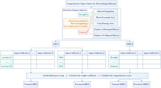 The SHCI and MHCI can be further categorized into absolute and relative indices. These two variants follow an identical calculation process, with differences only in indicator selection. Therefore, only the absolute is presented in the figure, and the differences in indicator selection are elaborated in subsequent sections. The specific method framework is shown in Figure 2: arrows indicate the sequence of data processing and calculation, while colors are employed solely for emphasis and differentiation between various types of meteorological hazards or distinct samples.