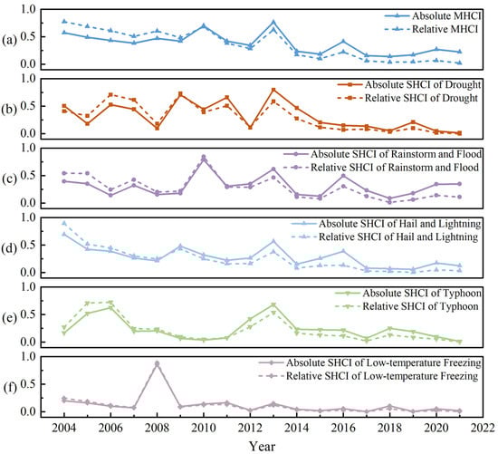 Changes in the national absolute and relative MHCIs and SHCIs from 2004 to 2021. (a) Absolute and relative MHCI; (b) Absolute and relative SHCI of Drought; (c) Absolute and relative SHCI of Rainstorm and Flood; (d) Absolute and relative SHCI of Hail and Lightning; (e) Absolute and relative SHCI of Typhoon; (f) Absolute and relative SHCI of Low-temperature Freezing.