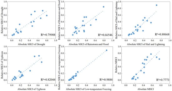 Figure 4 illustrates scatter plots and fitted lines of absolute and relative indices for different hazards, where the coefficient of determination (R2) quantifies the goodness of fit, reflecting the strength of the correlation between absolute and relative indices. A strong association exists between the absolute and relative impact indices of meteorological hazards in China (Figure 4). Their correlation is particularly robust for LTF, indicating that the relative influence of LTF depends mainly on the magnitude of the absolute impact. These findings underscore that for strongly associated hazards, proactive measures should be implemented in advance in areas where such hazards occur frequently to mitigate their absolute impacts.