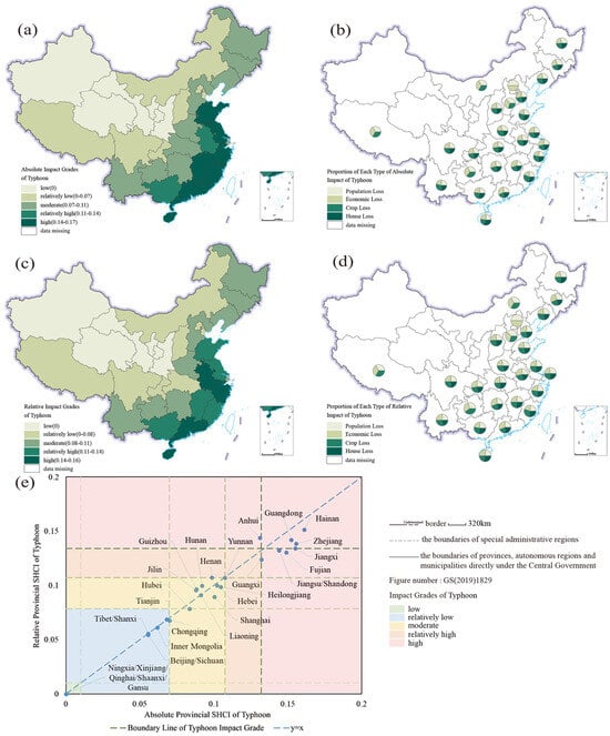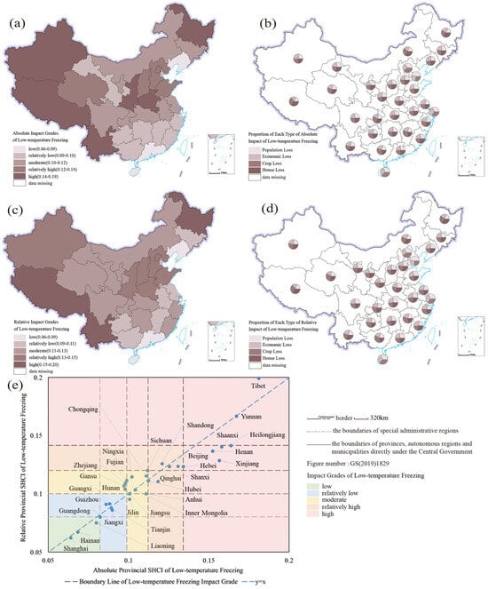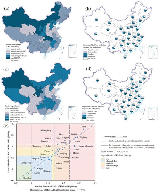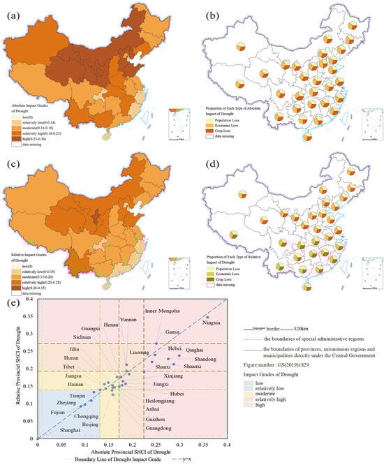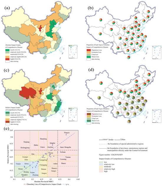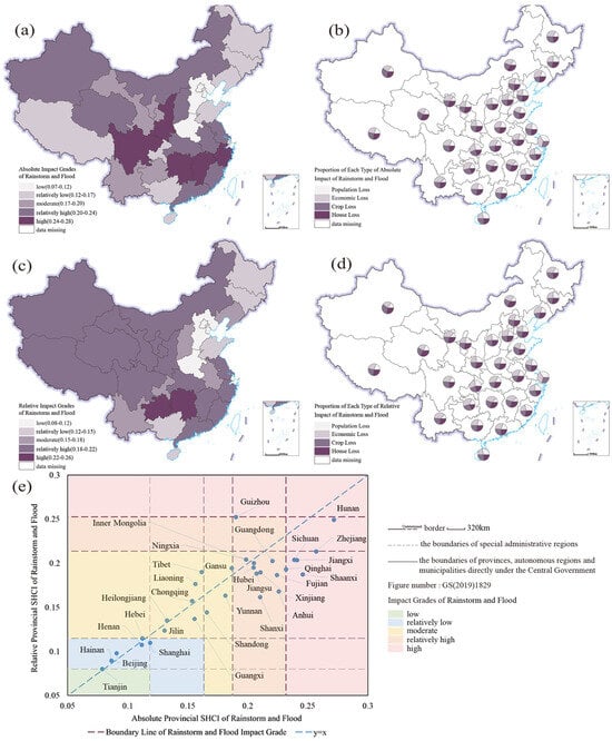 Distribution of provincial MHCIs and proportions of each type of impact from 2004 to 2021. (a) Absolute impact grades of comprehensive disaster; (b) Proportion of each type of absolute impact of comprehensive disaster; (c) Relative impact grades of comprehensive disaster; (d) Proportion of each type of relative impact of comprehensive disaster; (e) Impact grades of comprehensive disaster. In (e), the lines of different colors represent the boundaries of different grade ranges of the index obtained by the natural breakpoint method, and the blue diagonal line is y = x.