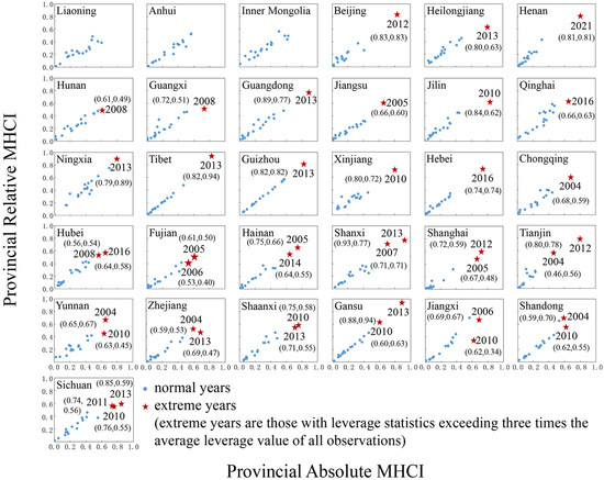 Identification of extreme years via the provincial absolute and relative MHCIs from 2004 to 2021. The specific index values of extreme years are presented in the form of coordinate points, where the horizontal axis represents the provincial absolute MHCI and the vertical axis represents the provincial relative MHCI.
