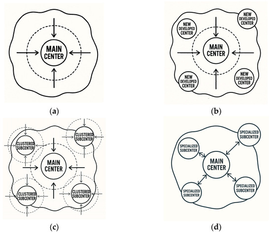 Monocentric cities—the most common urban spatial form—are characterized by a single center, typically located near the city’s geographic center, with residential peripheral areas. In such cities, the center performs comprehensive functions, including administration, commerce, employment, and public services, while peripheral areas heavily rely on it. Accessibility to those functions decreases significantly as the distance from the center increases. With population growth and urban expansion, issues such as traffic congestion and land scarcity gradually emerge, leading to the development of new centers (Figure 2a).