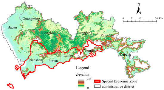 The study area covers Shenzhen, excluding the Shenshan Cooperation Zone, with a total area of 1997.47 km2. It comprises nine administrative districts and one functional zone (Figure 3); among these, Futian, Nanshan, Luohu, and Yantian—collectively referred to as the SEZ—were prioritized during the city’s early development. Analyses were conducted annually, and four representative years—1986, 2000, 2010, and 2020—were selected for detailed analysis as they correspond to the beginnings and ends of successive master plans.