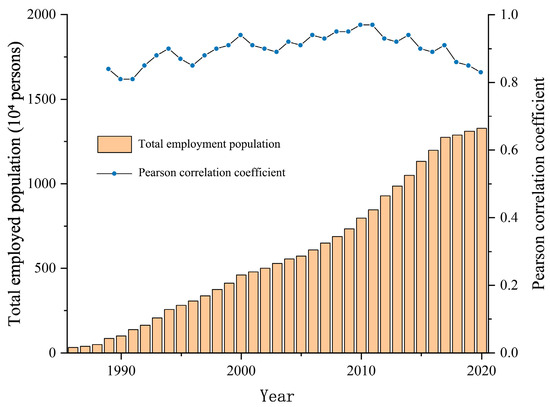 Total employment in Shenzhen (1986–2020) and Pearson correlations between weighted employment structure and sectoral employment statistics (1989–2020).