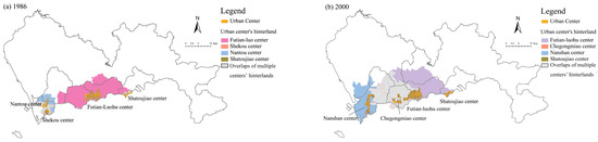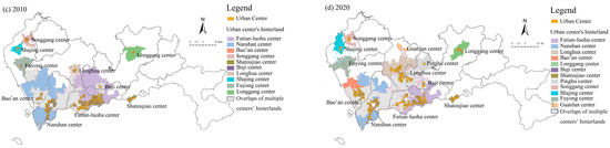 Polycentric urban structures and the hinterlands of urban centers in Shenzhen (1986–2020): (a) Polycentric structure and hinterlands of urban centers in 1986; (b) polycentric structure and hinterlands of urban centers in 2000; (c) polycentric structure and hinterlands of urban centers in 2010; (d) polycentric structure and hinterlands of urban centers in 2020.