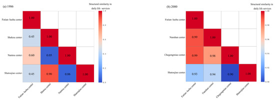 Structural similarity in daily life services among centers in Shenzhen (1986–2020): (a) Structural similarity in daily life services in 1986; (b) structural similarity in daily life services in 2000; (c) structural similarity in daily life services in 2010; (d) structural similarity in daily life services in 2020.