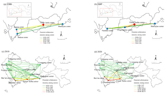 Potential collaboration intensity among centers in Shenzhen (1986–2020): (a) Potential collaboration intensity in 1986; (b) potential collaboration intensity in 2000; (c) potential collaboration intensity in 2010; (d) potential collaboration intensity in 2020.