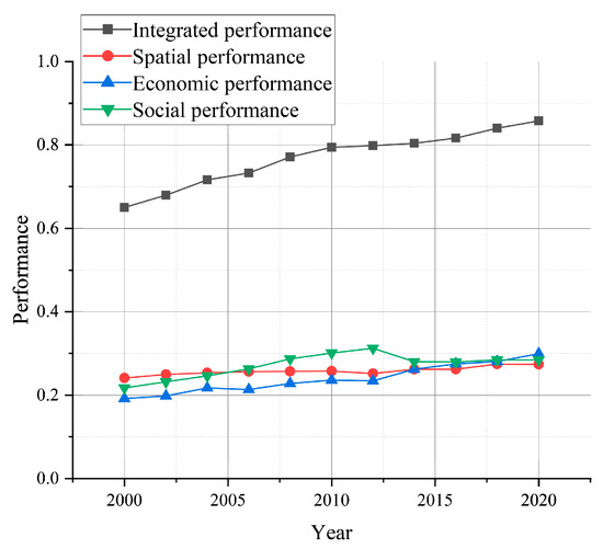 Evolution of integrated, spatial, economic, and social performance (2000–2020).
