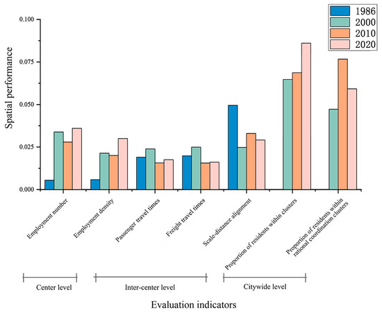 Spatial performance improved from 2000 to 2020, mainly influenced by the growth in the number of cluster centers and the development of the clustered polycentric structure—an evolution that closely tracked successive master plans. The scores for the spatial performance indicators are presented in Figure 10. At the center level, Shenzhen was at an early stage in 1986, and most centers—except Futian–Luohu—were small in both scale and intensity. By 2000, driven by agglomeration economies, both indicators increased markedly. In 2010, they declined slightly with the emergence of new centers outside the SEZ but then rebounded in 2020 as those centers matured. At the inter-center level, passenger and freight travel times were longer in 2010 and 2020 than in 1986 and 2000, reflecting longer trips associated with the development of new centers outside the SEZ. Between 2010 and 2020, passenger transport scores increased more than freight scores, largely due to expansion of the rail-transit network, which improved inter-center accessibility. Scale–distance coordination was highest in 1986, followed by 2010, 2020, and 2000. In 1986, apart from Futian–Luohu, other centers were small in scale and spatial competition was minimal. By 2000, coordination between the Futian–Luohu and the Chegongmiao centers, and that between the Chegongmiao and Nanshan centers, became sub-optimal, with competition arising among large centers in close proximity. In 2010, the emergence of peripheral centers slightly alleviated overall inter-center competition. By 2020, however, inter-center coordination deteriorated again, due to some centers failing to align their scales and spacing. At the city level, the proportion of residents within clusters increased steadily. However, the proportion of residents in rationally coordinated clusters first rose and then fell. The 2010–2020 decline was attributed to the same factors that drove the decrease in scale–distance coordination.