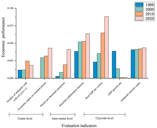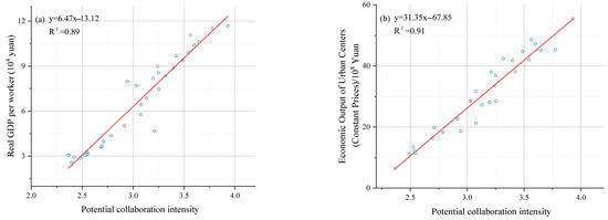 Unlike studies of networked polycentricity at the urban-agglomeration scale, city-level research requires more granular data, such as inter-firm investment flows and communication (e-mail) data. However, such data are often difficult to obtain, especially for multi-decade longitudinal studies. Similarly, we estimated the potential collaboration intensity between centers from a functional perspective, using a modified gravity model. We hypothesize that when there is industrial complementarity between centers, their potential for collaboration is greater. To validate its effectiveness, we performed a linear regression analysis between the potential collaboration intensity and the non-commuting trips between centers, with R2 values of 0.94 and 0.95 (Figure 14b), supporting the construct validity of our approach. Although networked characteristics strengthened over time, these changes were primarily driven by the agglomeration scale and geographic proximity of its centers, rather than by industrial complementarity. To improve cross-context transferability, the study attempts to propose benchmarks to define the networked polycentric stage based on the theoretical framework and the results of this research. First, functional differentiation should be clearly evident: the structural disparity between centers should exceed 0.4, ensuring that centers perform complementary rather than redundant roles. Second, spatial distribution should be balanced within practical interaction ranges: the average distance between main centers should be approximately 15 km, while that between secondary centers should be around 10 km. Third, the efficiency of transport and communication linkages should guarantee timely interactions, such that the maximum inter-center travel time remains below 60 min under normal conditions. Taken together, these thresholds indicate that a polycentric structure may be regarded as ‘networked’ when its centers are functionally differentiated, spatially balanced, and tightly integrated through efficient connectivity. Furthermore, the existence of cross-level linkages among centers should be acknowledged; this aspect was not addressed in our study. In cross-level contexts, this research approach remains applicable: centers should first be identified at each level, after which potential collaboration intensity can be computed. When data conditions allow, inter-center investment and financing data are superior indicators for characterizing networked polycentric structures, as they more accurately capture the economic linkages generated by firms’ productive activities. When the intensity of investment and financing between centers—whether at the same or different levels—is significantly higher than that observed in other regions, it indicates that a networked polycentric structure has emerged. Within cross-level networked structures, when a lower-level center has a functional structure that differs substantially from that of a higher-level center and therefore occupies an important position within the overall networked polycentric structure, it may expand and upgrade to a higher-level center. Conversely, when a lower-level center is functionally similar to higher-level centers, competition persists. When the lower-level center is located far from functionally similar higher-level centers, it may persist because it assumes a functional role within the overall networked polycentric structure; if it is located close to functionally similar higher-level centers, it may be absorbed or naturally disappear. According to the borrowed size effect, cross-level networked characteristics should likewise enhance urban economic performance, although their effects are typically weaker than those of networked characteristics among higher-level centers.