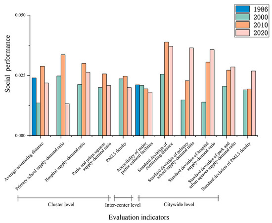 From 2000 to 2020, social performance followed an inverted U-shaped trajectory, peaking in 2010. This result is unexpected: despite Shenzhen’s considerable efforts to improve social performance, the partially clustered polycentric structure in 2010 outperformed the fully clustered polycentric structure in 2020. The scores for the social performance indicators are presented in Figure 13. In 2010, the newly developed centers contributed to an overall improvement in residents’ quality of life. The new centers were small in scale, with low enterprise density and low air pollution, and formed compact clusters with shorter commuting distances. The smaller populations in these clusters increased per capita access to public services. At that time, social equity was poor due to disparities between new and established clusters. By 2020, as these centers matured, enterprise density increased and air quality declined. The clusters expanded spatially, and commuting distances lengthened. During the period 2010–2020, these clusters consistently attracted population inflows due to their comparative advantages; however, the provision of public services lagged, worsening supply–demand relationships for education, healthcare, and public amenities. For example, from 2010 to 2020, the Longhua cluster’s population grew by 2.16 million, while its primary schools increased by only 43, reducing the number of primary schools per 10,000 residents from 0.58 to 0.21. This indicates that the decline in social performance after 2010 was not merely the result of polycentric structure evolution but rather reflected underlying governance challenges. The mismatch between demographic growth and infrastructure expansion limits the ability of polycentric structures to deliver sustained improvements in residents’ quality of life [17,47]. Although spatial equity among clusters in 2020 was improved relative to 2010, this was achieved at the cost of lower quality of life. These dynamics suggest that achieving social performance under rapid urbanization requires not only clustered polycentric structures, but also stronger institutional frameworks and policy coordination to balance demographic growth with the provision of services.