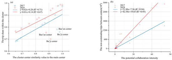 Linear relationships (a) between the cluster center similarity value to the main center and the trip share within the cluster; (b) between the potential collaboration intensity and the non-commuting trips between centers.