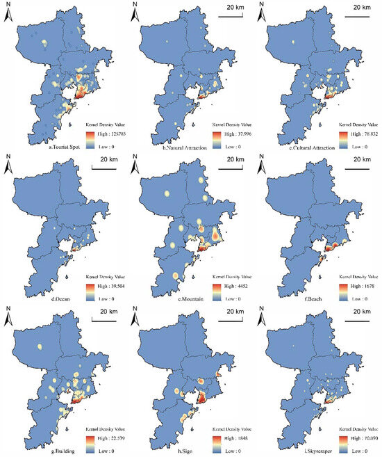 - From the perspective of the spatial distribution of tourist attractions, tourist attractions in Qingdao generally present a spatial pattern of “distribution around bays and agglomeration towards the sea”, showing a core–periphery structure pattern of agglomeration along the coast and dispersion inland. Different tourist attraction elements show different spatial distribution characteristics: natural tourist attractions form agglomeration centers along the coastal zone and spread in a point-like manner, showing distinct coastal regional characteristics—among them, coastal and sand elements are distributed alongside each other, concentrated at the western end of the Eastern Coast Qianhai Bay Area; mountain elements show the characteristic of “coastal agglomeration and multi-core dispersion”. Humanistic tourist attractions are mainly agglomerated at the western end of the Eastern Coast Qianhai Bay Area, with secondary cores scattered in a point-like manner from the coast to inland areas across various counties and districts—among them, building elements are mainly distributed in a planar agglomeration along the coast and in an isolated point-like manner in inland areas; sign elements are distributed around bays and form coastal agglomeration clusters; skyscraper elements are basically consistent with the overall distribution of humanistic tourist attractions.