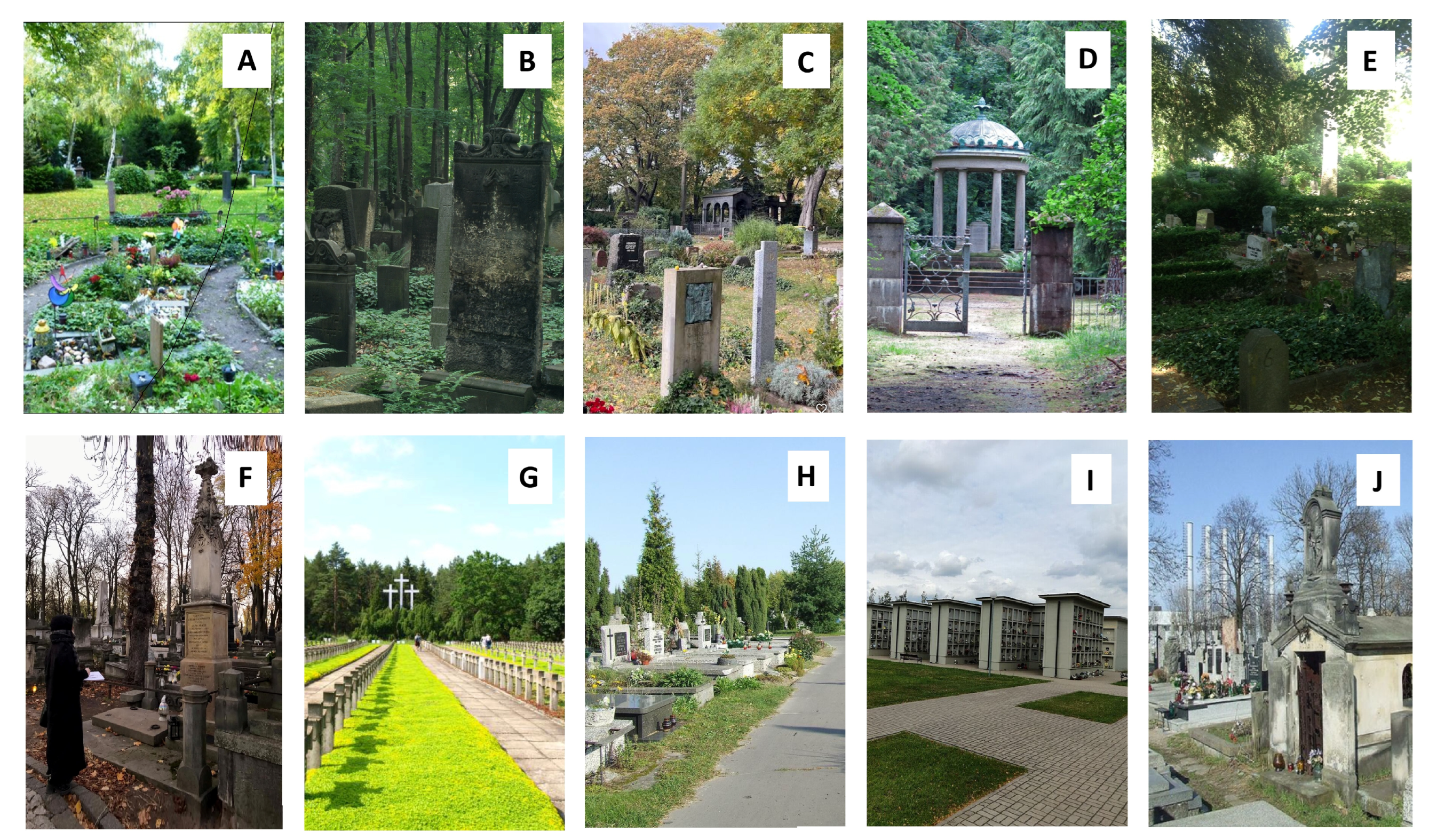 45]. In contrast, in Poland, the burial area is determined by managers (church administration or religion groups stakeholders); rarely are they part of common landscape planning for social and future needs, except for two selected examples of Warsaw city (Cmentarz Północny, Cmentarz Południowy) designed basically as big-scale open burial spaces with decorative vegetation and meadows [