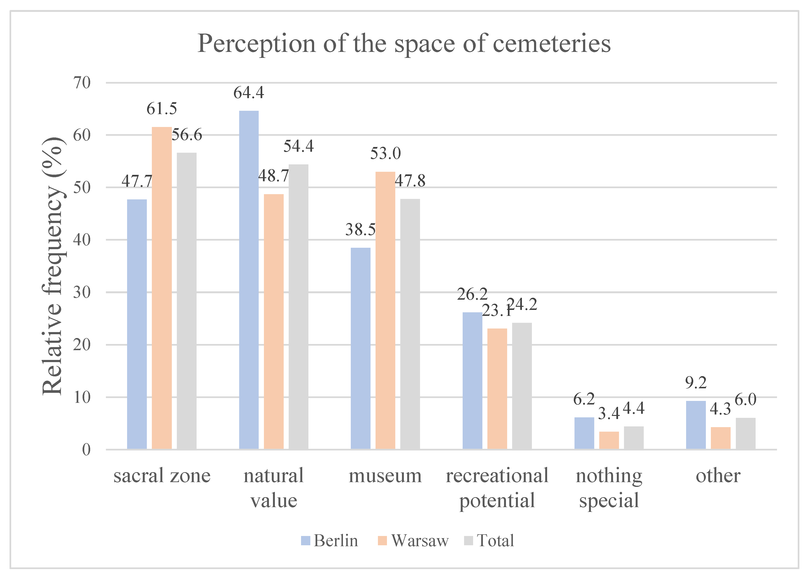 51]. Regardless of the place of living and nation, the respondents consider cemeteries to be an important element of the structure of cities. In our research, we observe that Berliners more often than Warsaw residents notice the natural value of these areas, which may be due to the greater care of the Germans for greenery and a higher degree of care for its condition, also due to the horticulture tradition observed strongly in the extra question form in the questionnaire survey asking about having flowers in gardens by respondents. This may be due to the fact that cemeteries are treated as memorial parks where you can go for a walk and admire nature, whereas in Poland, such an approach is far from the everyday reasoning of the younger generation. Young people in Poland occasionally treat cemeteries as a kind of museum with historical tombstones, but this applies mainly to historic cemeteries, such as Powązki Old Cemetery in Warsaw. This idea is closer to the idea of thanatotourism [