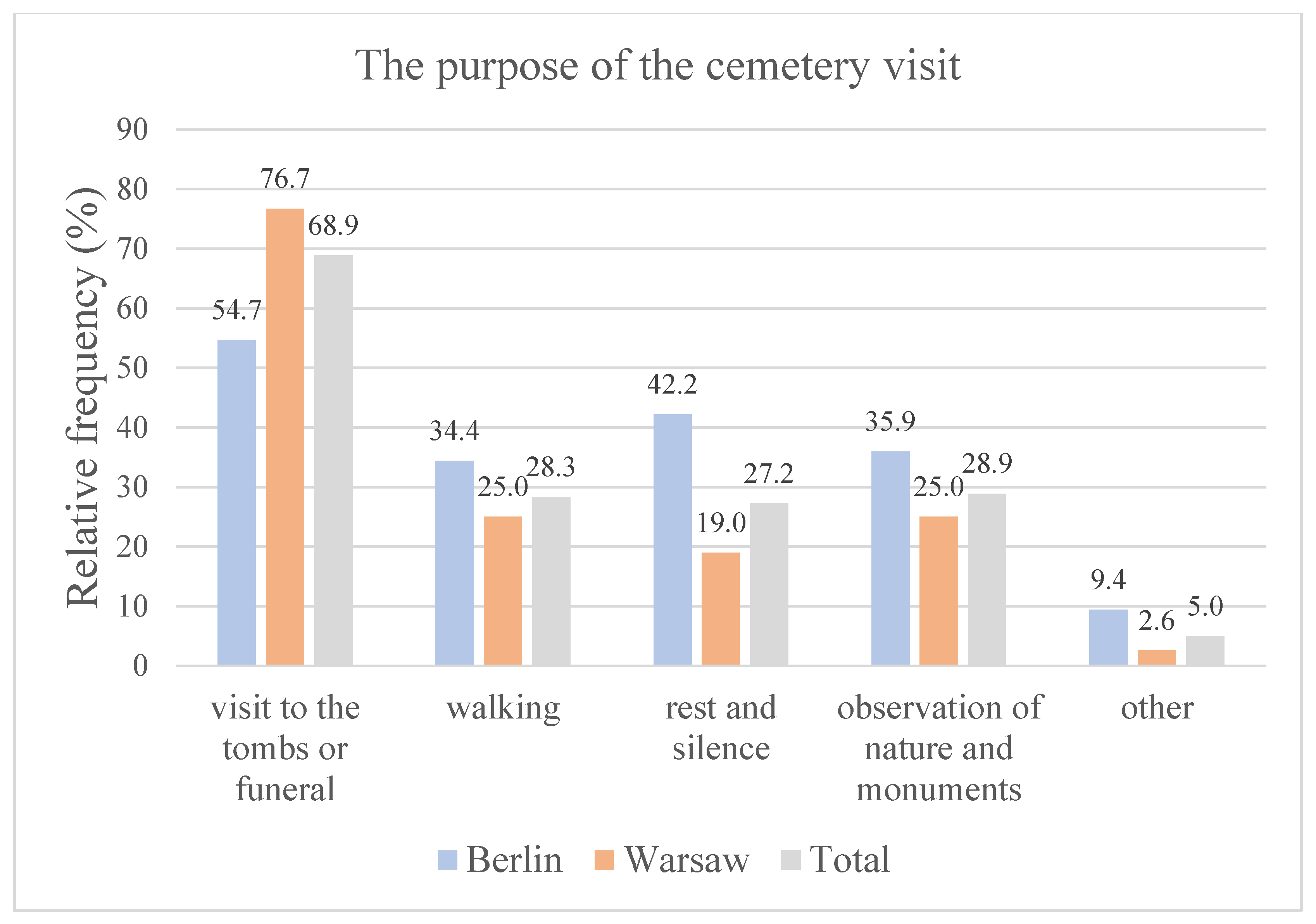 2= 11,226; df = 1). Berliners went to the cemetery to walk and observe nature more often than Warsaw respondents, but this difference was not statistically significant (respectively,