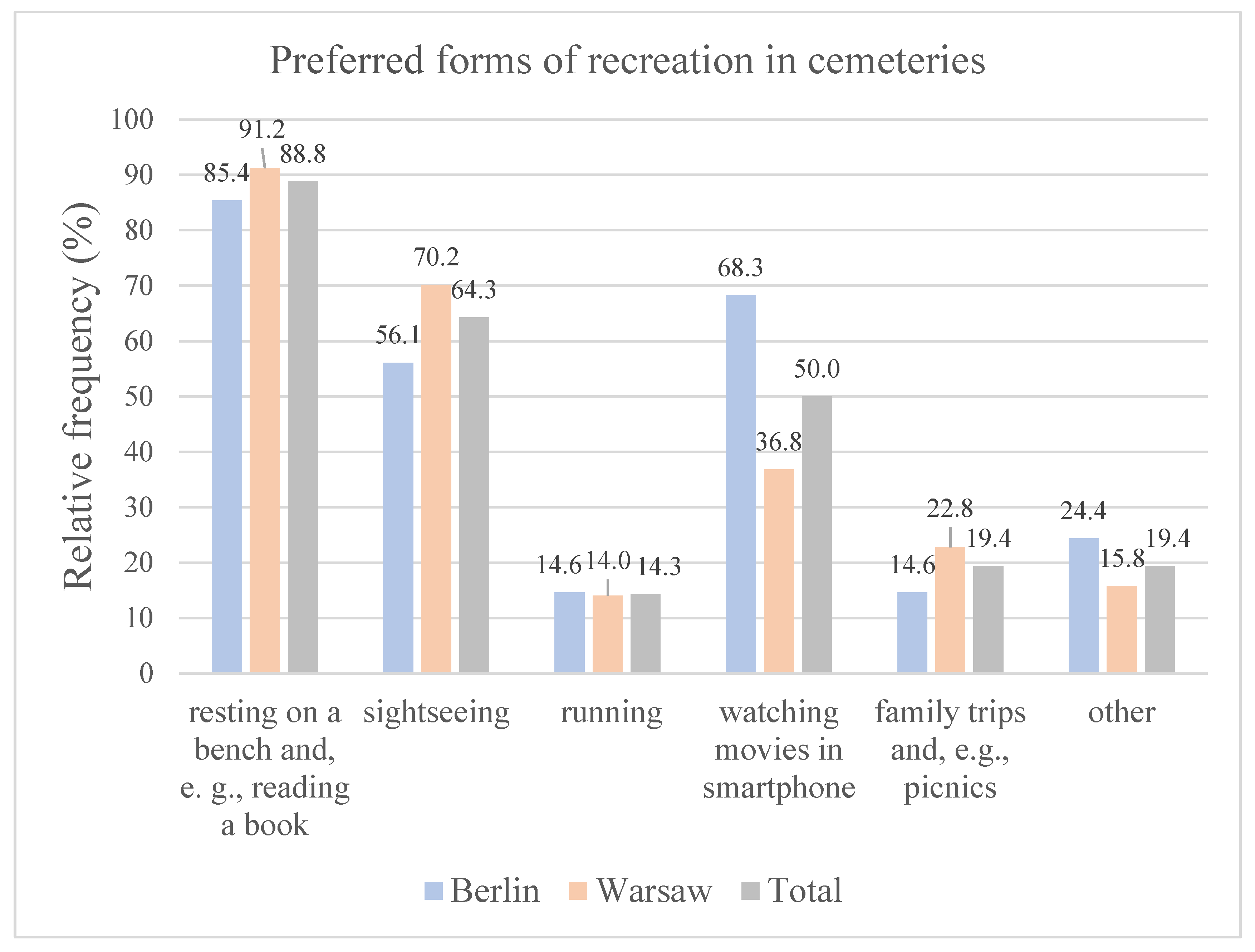 Figure 6. The most popular form of recreation indicated by the respondents, regardless of where they lived, was resting on a bench and, e.g., reading books. Slightly less often, they pointed out that the acceptable form of recreation in the cemeteries was sightseeing, although this form of activity was more often tolerated by the inhabitants of Warsaw. Respondents from Berlin were more likely to choose watching movies as an acceptable form of recreation, and this was the only statistically significant difference (