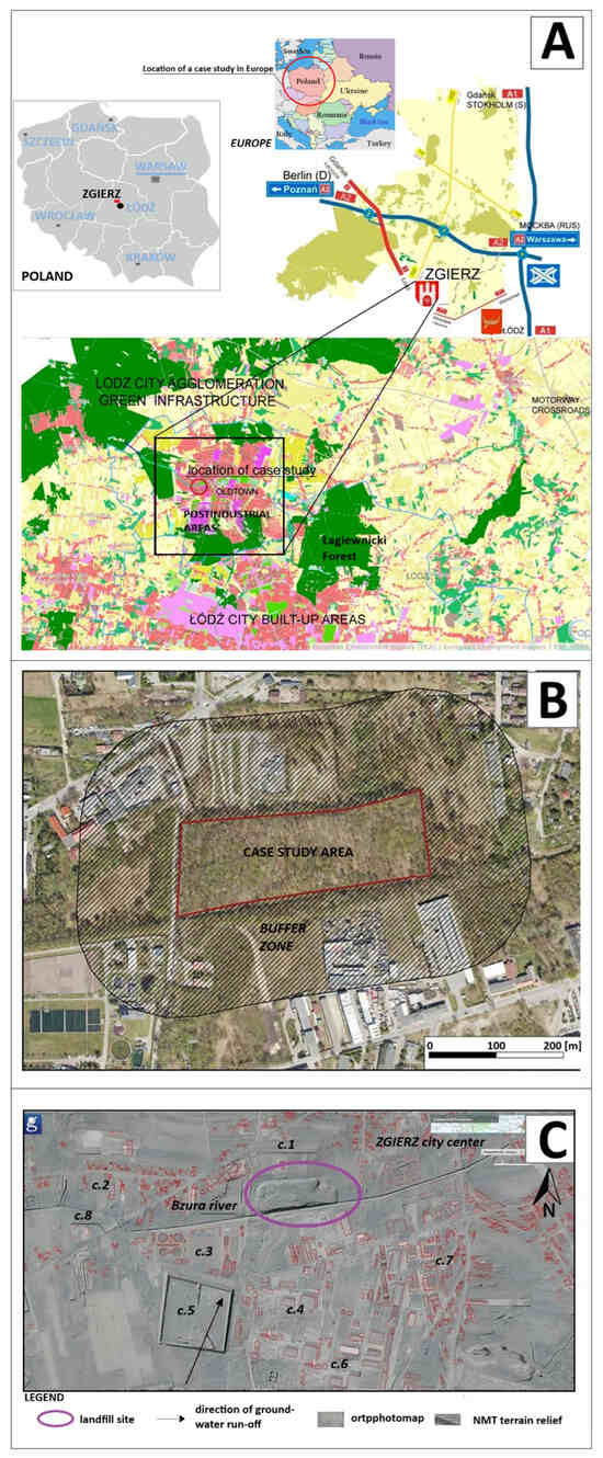 - Długoński, A.; Bernat, P.; Słaba, M. Skarpy składowisk odpadów przemysłowych, ze szczególnym uwzględnieniem składowiska “za Bzurą” w Zgierzu (Polska)—Aspekty techniczne, toksykologiczne i krajobrazowe. In Konferencja Ekobiotox, Znaczenie Ekotoksykologii, Bioindykacji, Biodegradacji w Identyfikacji i Rozwiązywaniu Problemów Środowiskowych w Dobie Antropocenu i Zmiany Klimatu od Skali Molekularnej do Krajobrazowej; Book of abstracts; Lisowska, K., Ed.; Univeristy of Łódź: Łódź, Poland, 2022; p. 22. [Google Scholar]