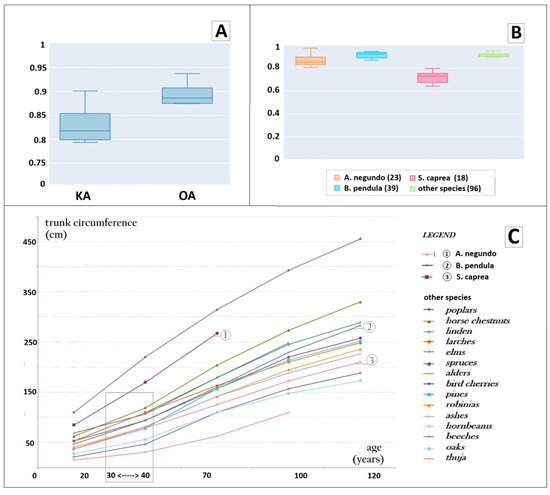 - Łukaszkiewicz, J.; Długoński, A.; Fortuna-Antoszkiewicz, B.; Fialová, J. The ecological potential of poplars (Populus L.) for city tree planting and management: A preliminary study of Central Poland (Warsaw) and Silesia (Chorzów). Land 2024, 13, 593. [Google Scholar] [CrossRef]