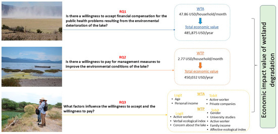 22] through a contingent valuation survey. Furthermore, this work seeks to analyze the socioeconomic and temporal factors that influence the demand for improved management. For this work, Lake Cuitzeo in México has been selected as a case study. This lake is an emblematic wetland that is undergoing a process of ecological deterioration in both water quantity and quality. This has had a direct negative effect on the health of the population living around the wetland. Thus, the economic impact valuation of degraded wetlands allows us to quantify the economic impact of environmental degradation and justify investments in conservation/restoration. This has a direct relationship with the promotion of measures/policies that promote public health and favors disease prevention at the collective level, while also influencing the quality of life and well-being of people within their living environment.