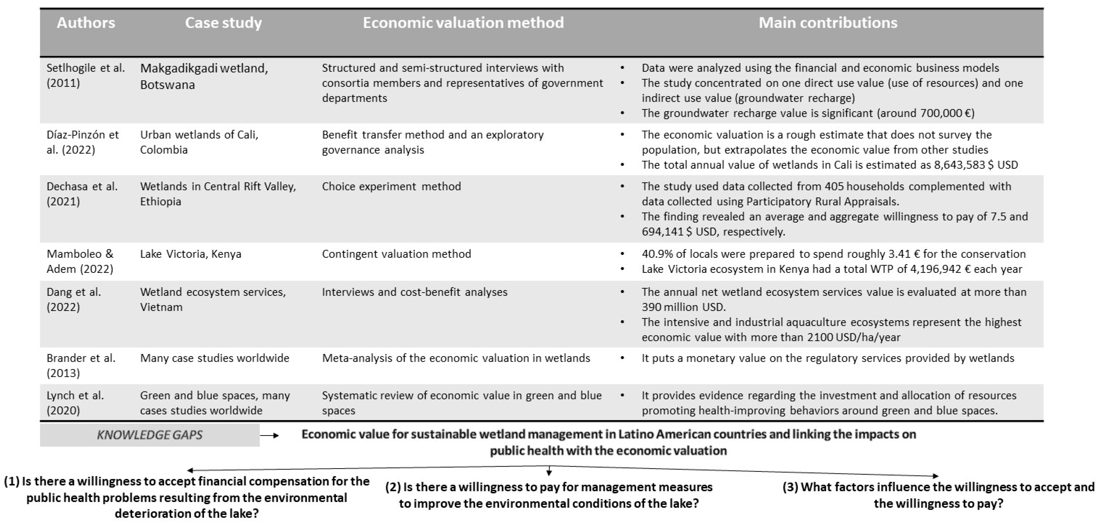 The use of the contingent valuation method makes a valuable contribution to the existing literature, offering insight into the prevailing economic value of sustainable wetland management. Therefore, this work seeks to generate scientific knowledge through three key contributions: (I) test the economic value of the population health of inhabitants living near the wetland, (II) test the economic value of management measures that promote sustainable development in the wetland area, and (III) test the factors influencing the behavior of individuals towards the economic impacts valuation of the lake. It should be emphasized that the novelty of this work does not lie in the method itself, but in its application to a case study that has rarely been examined from the perspective of wetland environmental economics. Furthermore, its novelty lies not only in the scarcity of Latin American studies, but also in the explicit link it establishes between public health impacts and the economic valuation of wetland degradation.