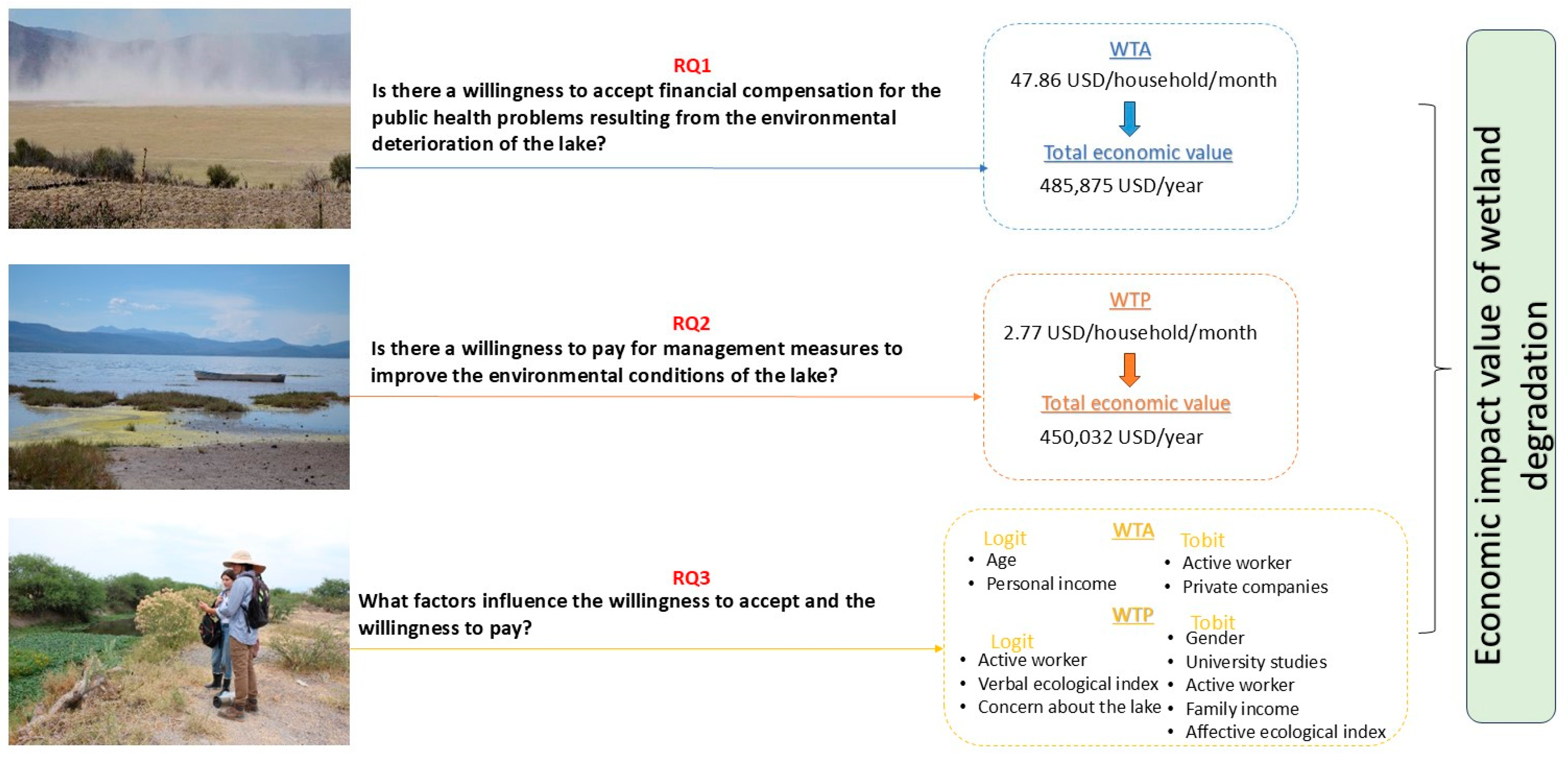 This work has demonstrated the economic impacts associated with the degradation of a wetland in Mexico, using Lake Cuitzeo in the state of Michoacan as a representative case study. A significant proportion of the population is willing to accept economic compensation for damage to public health, also willing to pay for the implementation of management measures to improve the environmental status of the wetland.