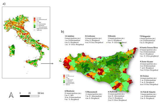 - Comuni Della NSIA Area Troina. Strategia Territoriale dell’Area Interna Troina. Caratteristiche, Fabbisogni e Identità dell’Area Interna Troina Nella Programmazione Territoriale 2021–2027 in Sicilia. Available online: https://www.regione.sicilia.it/sites/default/files/2024-11/ALL.%201%20al%20DDG%20N.%20741-2024%20AI%20TROINA.pdf (accessed on 2 May 2023).