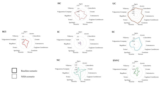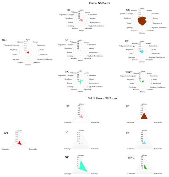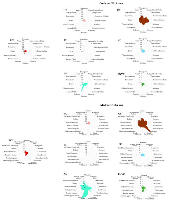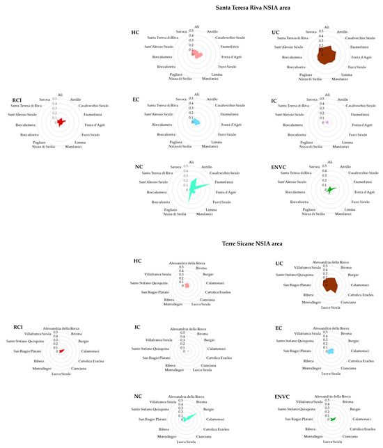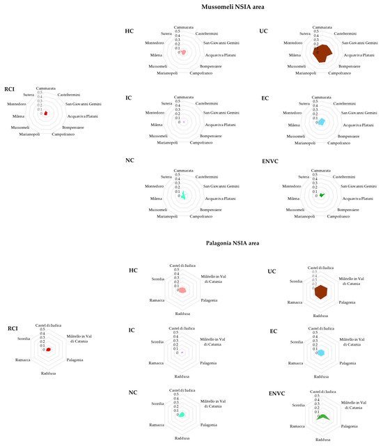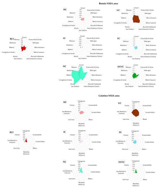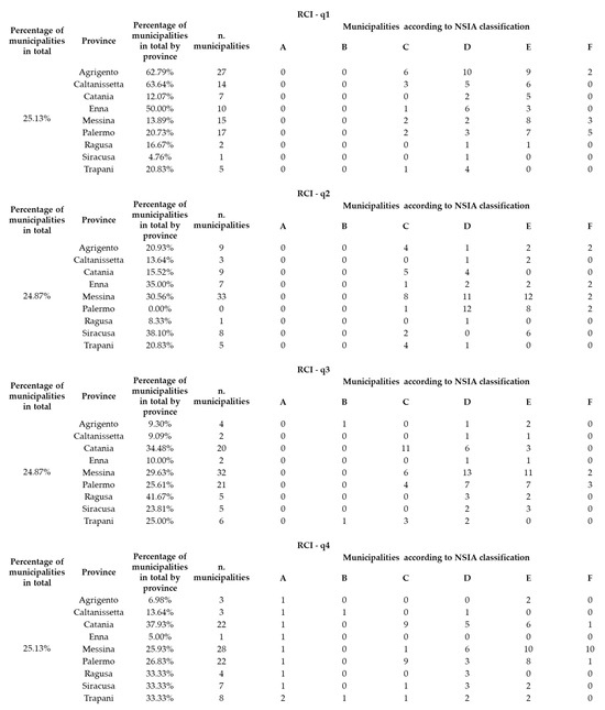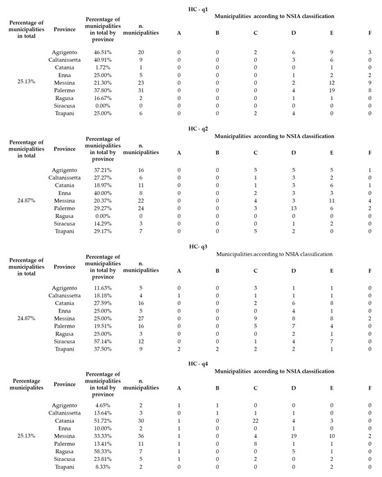 - The municipalities with the worst endowment, i.e., those in the first quartile of the index, are in the provinces of Agrigento and Caltanissetta. According to the NSIA classification, most of them are classified as D—Intermediate, E—Peripheral or F—Ultra-peripheral. This shows that even municipalities considered less peripheral under the NSIA classification, such as those in class D (Intermediate), have low human capital endowment. Furthermore, it shows that municipalities in different NSIA classes have the same level of human capital endowment.