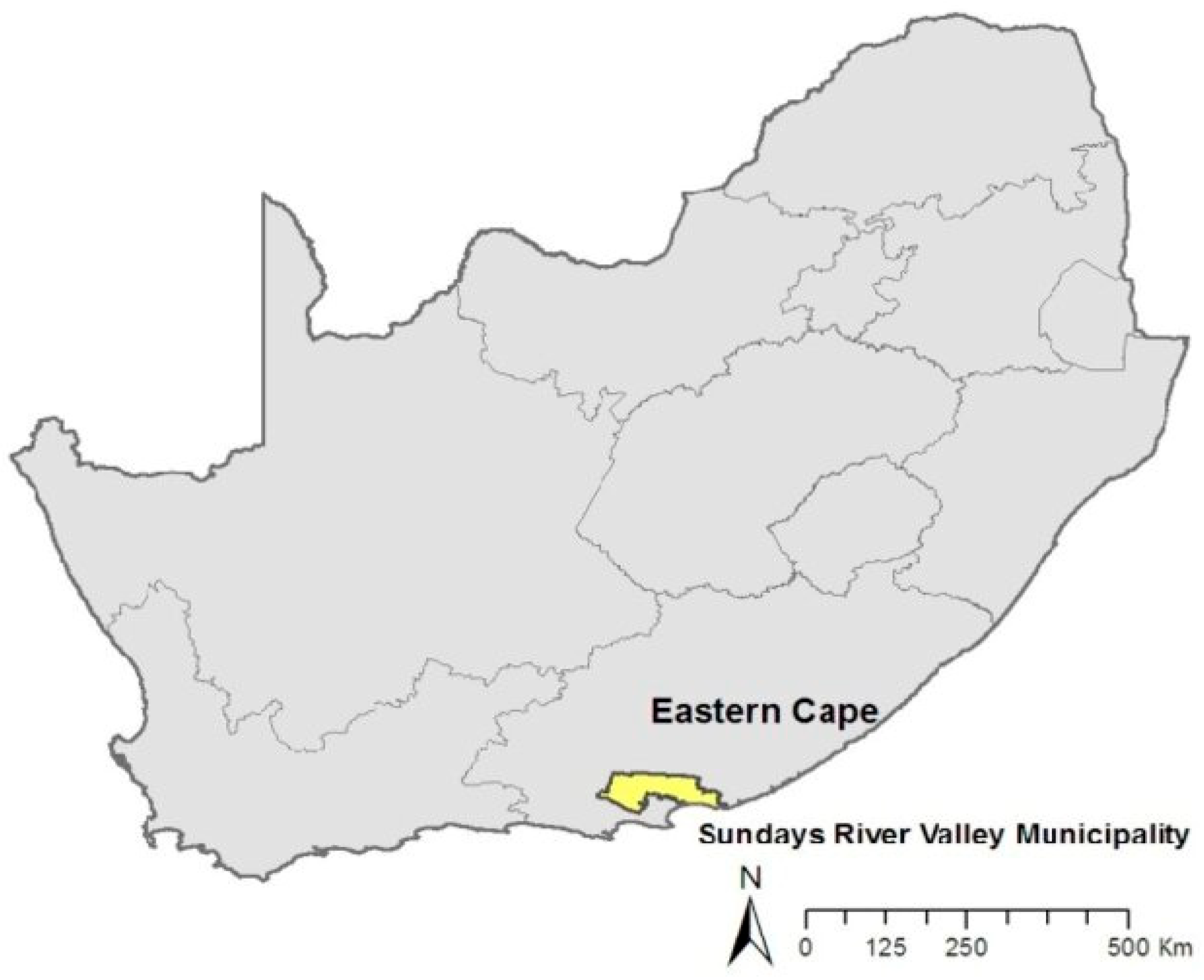 - Eastern Cape Socio-Economic Consultative Council (ECSECC). 2017 Sundays River Valley Local Municipality Socio-Economic Review and Outlook; Eastern Cape Socio-Economic Consultative Council: London, UK, 2017; Volume 31, pp. 213–227. [Google Scholar]