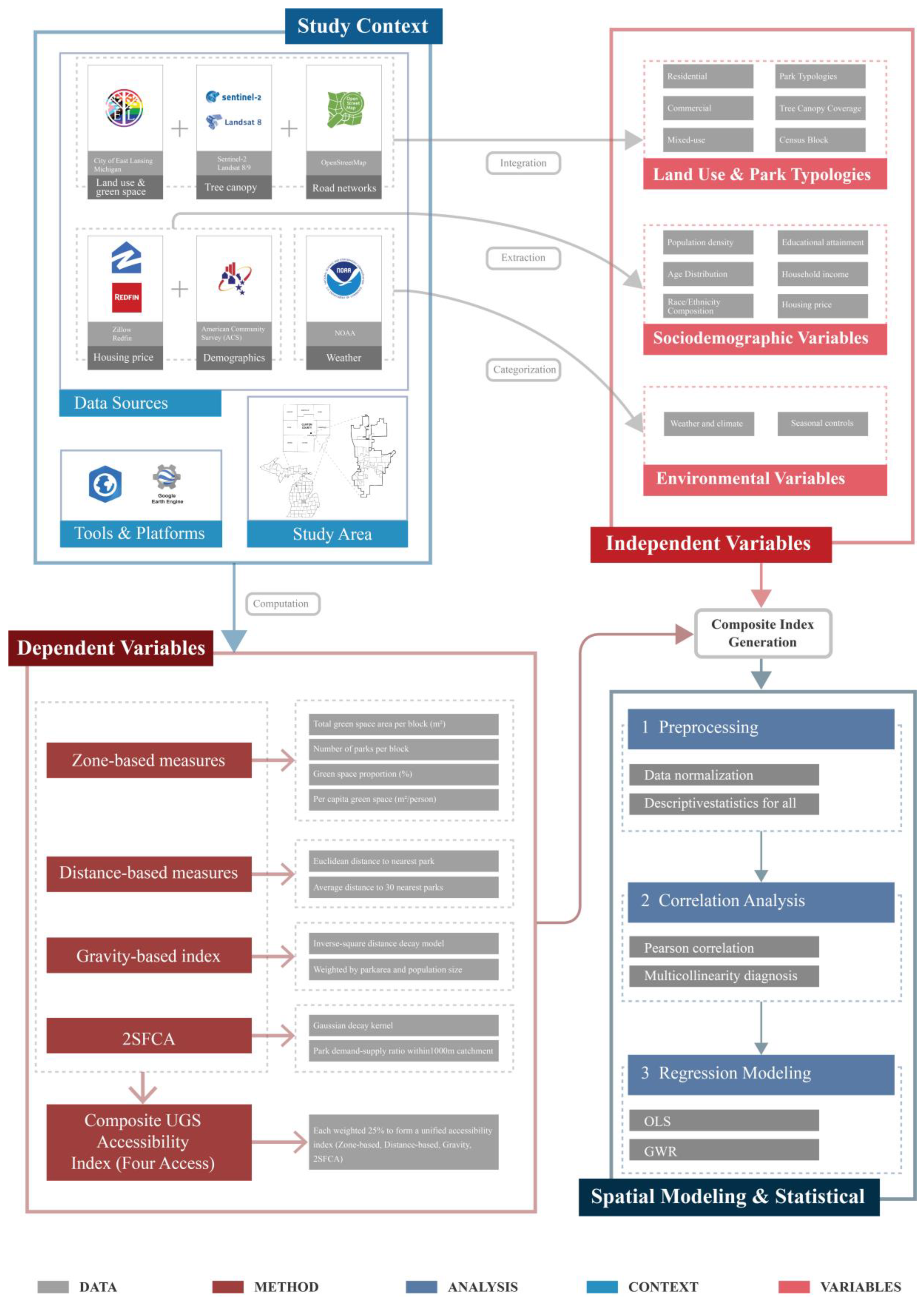 https://www.redfin.com). Additionally, local weather data were acquired from the National Oceanic and Atmospheric Administration (NOAA) to control for potential environmental influences. This diverse set of data sources provides a robust and comprehensive foundation for spatial analysis and statistical modeling of UGS accessibility.