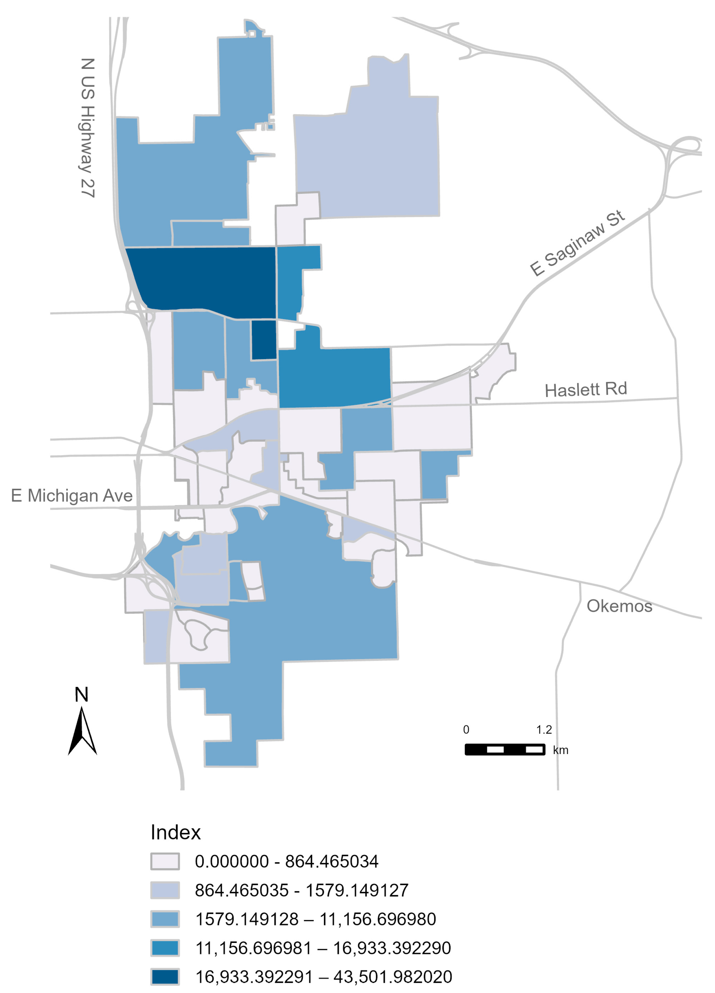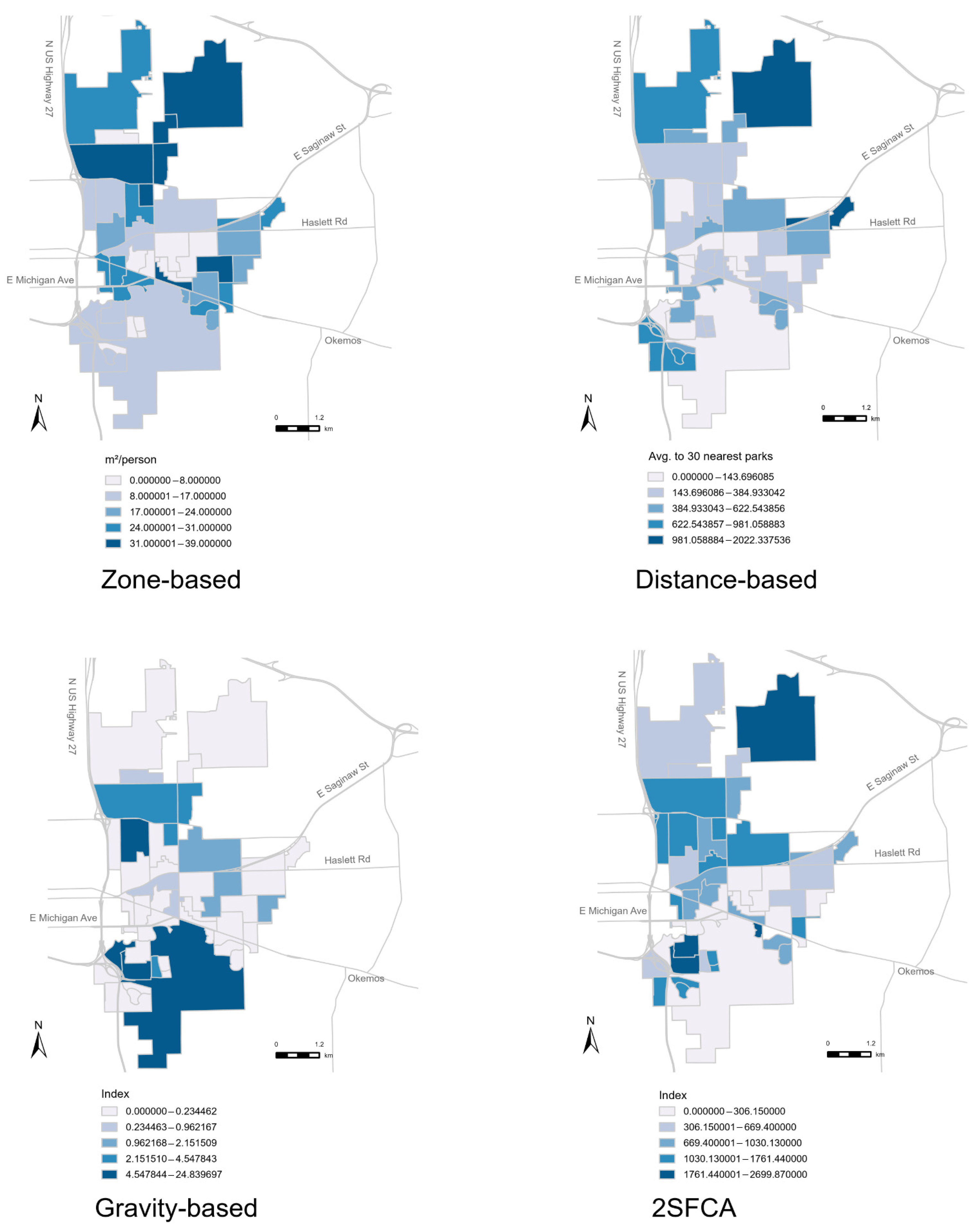 Figure 4). The composite index balances local distance effects with broader considerations such as UGS distribution, service scale, and potential competition, but also produces more consistent accessibility patterns across neighborhoods. For example, the composite index assigns higher accessibility values to neighborhoods located south of E Michigan Ave and west of Haslett Rd. These areas are underestimated by proximity-based models. In contrast, northern neighborhoods near E Saginaw St, which are overrepresented in the Zone-based model, receive more moderate scores. This indicates the composite index’s capacity to reduce extreme variation and provide a more realistic spatial representation. Furthermore, as will be shown in the next section, it also exhibits superior performance in statistical modeling.