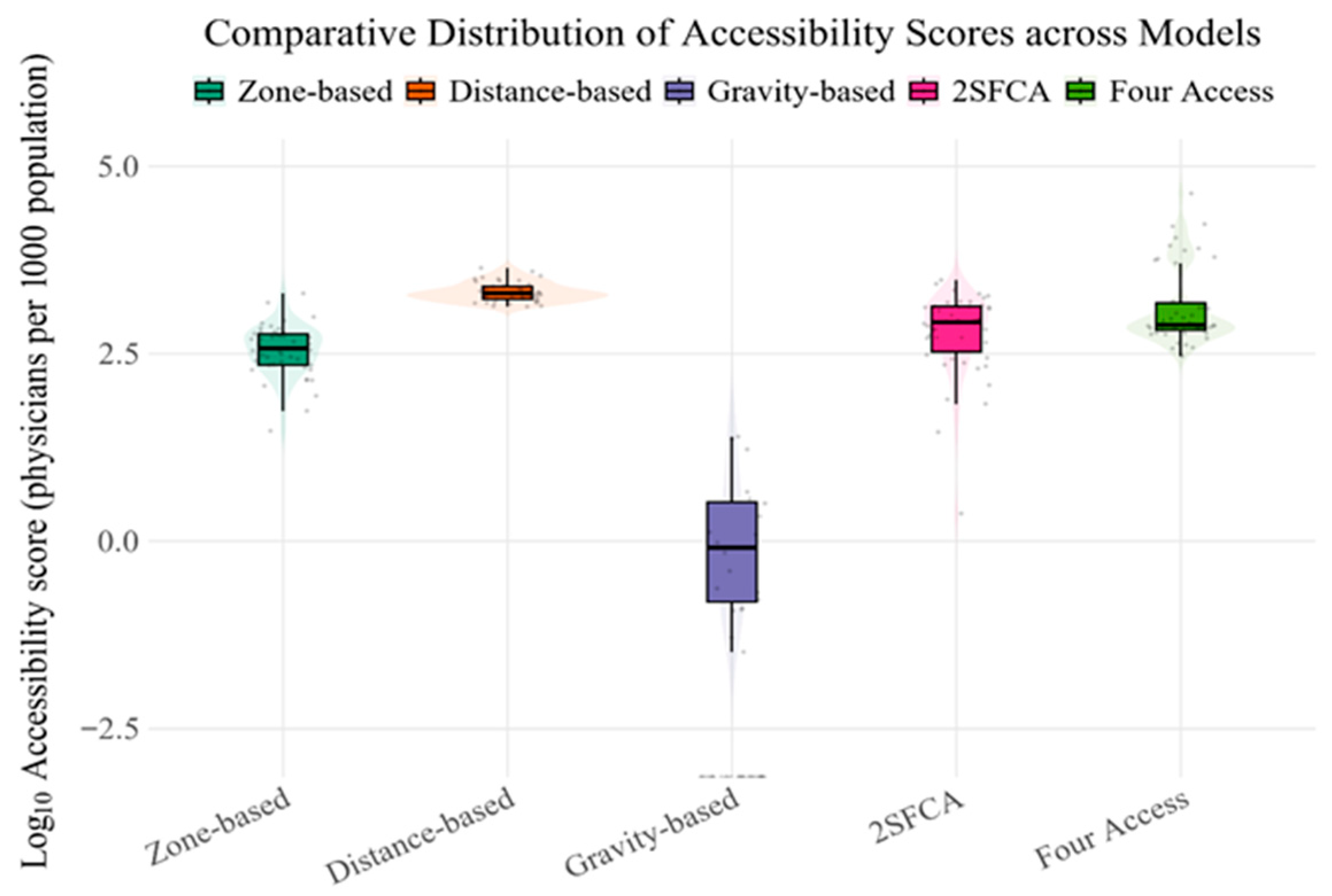Figure 5. Among them, the Distance-based model yields the highest overall values, while the Gravity-based model displays the lowest and exhibits the widest range. In contrast, the “Four Access” index exhibits a more centralized distribution, indicating a balanced and stable representation across neighborhoods. Robustness checks were conducted by varying the weighting scheme across the four models. These tests indicated that the distributional patterns of accessibility and the regression results remained consistent, suggesting that our findings are robust to reasonable variations in weight specification.