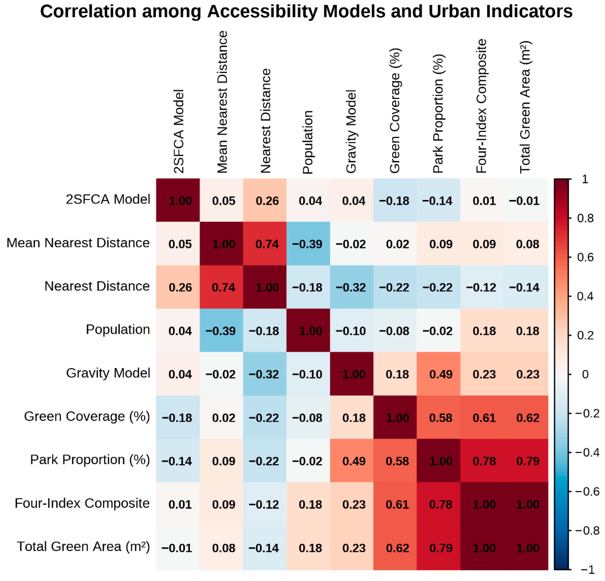 Figure 6 presents a correlation matrix that displays the pairwise associations between four spatial accessibility measures and a set of environmental and demographic variables. As shown, the gravity-based and composite indices show positive correlations with greening-related variables such as the proportion of parks, total green space area, and percentage of green land cover. This pattern indicates that these models are more sensitive to ecological supply characteristics. In contrast, proximity-based measures such as the nearest-distance index exhibit weaker or even negative correlations with those variables. Moreover, total population is negatively associated with proximity-based accessibility but demonstrates a modest positive correlation with the composite index.