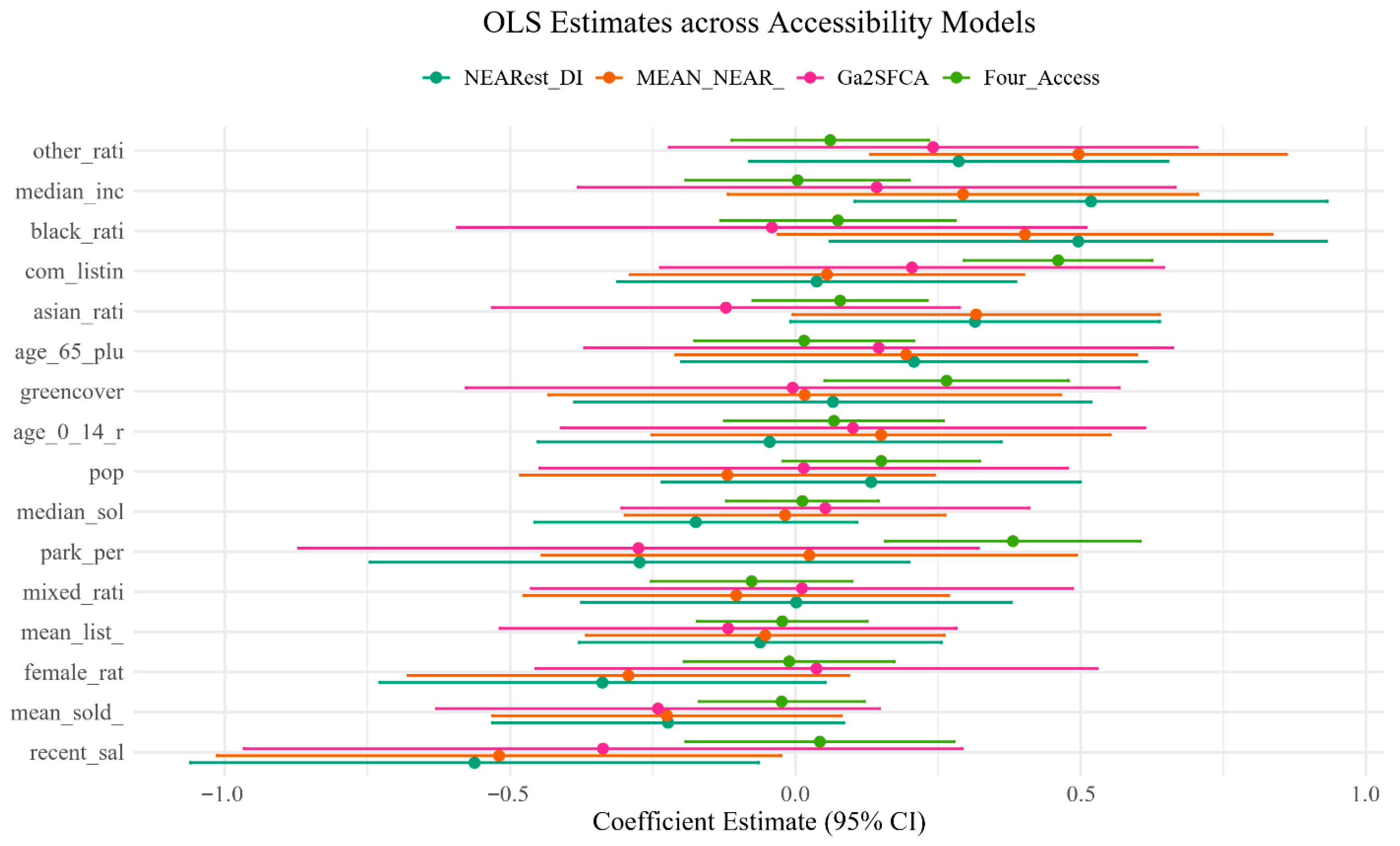 A visual summary of the OLS regression coefficients across the four accessibility models is provided in