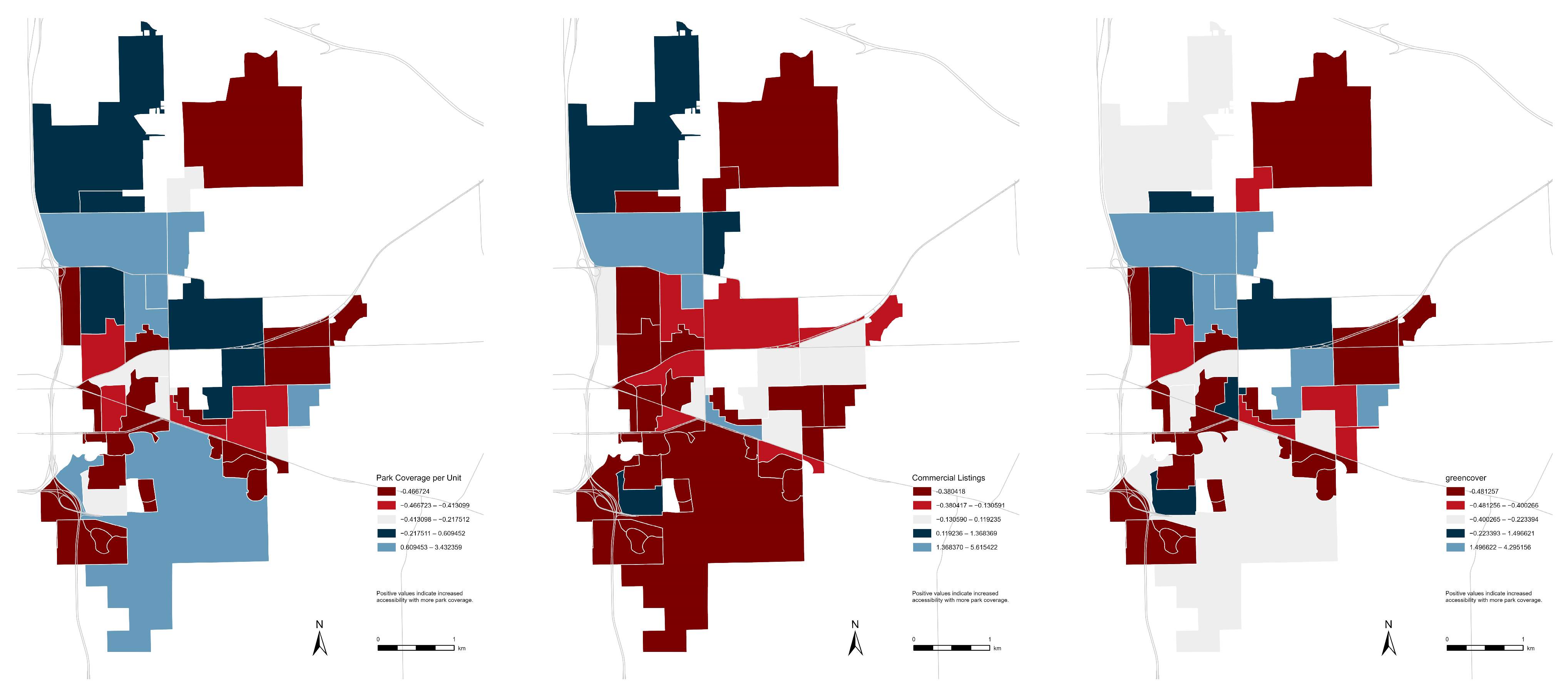 Understanding why such heterogeneity exists requires engaging with broader theories of urban political ecology and spatial governance. UGS is not randomly located, but is historically produced through processes such as discriminatory zoning, racialized disinvestment, suburban expansion, and targeted capital investment. In East Lansing, spatial disparities may reflect legacies of institutional planning choices such as exclusionary land use designations or infrastructure prioritization favoring certain districts. For example, areas near the university may have received sustained investments in green amenities to support student and faculty quality of life, while peripheral or historically marginalized neighborhoods may have lacked such sustained infrastructural provision. These place-specific dynamics explain why the same predictor may exert different effects in different contexts, as GWR reveals. In this sense, spatial heterogeneity in the accessibility model reflects not merely analytical nuance but structural inequalities embedded in urban land regimes. The comparative value of GWR lies not only in improved statistical fit but in its epistemological potential. It foregrounds difference over average, local knowledge over metropolitan abstraction, and allows urban scholars to trace the contingent mechanisms that drive accessibility inequalities. Methodologically, the value of GWR lies not only in improving statistical fit but also in its epistemological potential: it foregrounds local difference over metropolitan averages and enables scholars to trace contingent mechanisms driving accessibility inequalities. Practically, this implies that equity-oriented planning cannot rely solely on citywide standards but must adopt neighborhood-sensitive interventions—for example, prioritizing pedestrian infrastructure in dense central districts while expanding canopy cover in suburban residential areas.