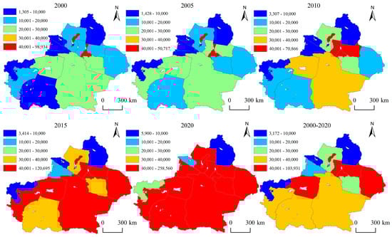 Overall, the total carbon footprint in Xinjiang showed a significant growth trend, increasing from a total area of 30.41 × 104 km2 in 2000 to 104.48 × 104 km2 in 2020, representing an approximate 3.44-fold increase. Spatially, the carbon footprint distribution in Xinjiang was notably heterogeneous. Although the total footprint was generally larger in the northern part than in the southern part, the growth rate in the southern region was significantly faster than that in the northern region.