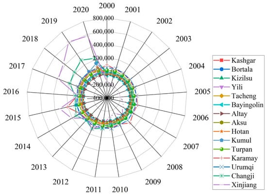From Figure 2, total annual NEP of vegetation in Xinjiang from 2000 to 2020 showed a slow upward trend, with the annual total NEP fluctuating and increasing from 6434.45 × 104 t in 2000 to 8149.66 × 104 t in 2020, with an average annual growth rate of 1.19%, and an average annual growth of 77.50 × 104 t yr−1. The smallest value of this was in 2000 at 6434.45 × 104 t, and the highest value occurred in 2016 at 8970.76 × 104 t. In summary, the annual total NEP of the vegetation in Xinjiang in the past 21 years, despite the fluctuation, showed a more significant increasing trend, indicating that the carbon fixation capacity of the vegetation in Xinjiang is increasing. It can also be seen that from 2000 to 2020, Xinjiang’s carbon emissions show a significant growth trend. The total carbon emissions in Xinjiang grow from 2836.08 × 104 t in 2000 to 15457.91 × 104 t in 2020, with an average annual growth rate of 8.84%, and an average annual growth of 657.04 × 104 t. Changes in total carbon emissions can be roughly divided into two stages, with a slow increase in carbon emissions between 2000 and 2010, with total carbon emissions growing from 2836.08 × 104 t in 2000 to 4941.98 × 104 t in 2010, with an average annual growth rate of 5.75%. Carbon emissions increased significantly between 2011 and 2020, with total carbon emissions growing from 6870.19 × 104 t in 2011 to 15,457.91 × 104 t in 2020, with an average annual growth rate of up to 9.3%, especially during the period of 2016–2020, indicating that Xinjiang’s economy is entering a stage of high-speed development, while also facing the serious challenge of energy consumption and carbon emission management.