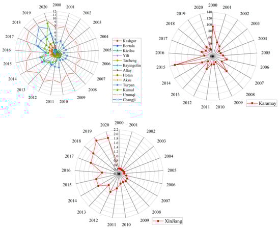As shown in Figure 3, the carbon footprints of 14 cities in Xinjiang exhibited an overall increasing trend, to varying degrees, from 2000 to 2020. These changes can be classified into three distinct patterns. First, Altay, Urumqi, and Turpan were classified as the slow-increase type, with their carbon footprints rising from 0.14, 6.18, and 2.27 × 104 km2 in 2000 to 0.59, 7.91, and 4.43 × 104 km2 in 2020, respectively. Second, ten cities—Aksu, Bayingholin, Bortala, Changji, Hotan, Hami, Kashgar, Kizilsu Kirgiz, Tacheng, and Yili—belonged to the significant-increase type, with their carbon footprints escalating from 2.64, 2.19, 0.13, 1.71, 0.35, 1.08, 1.87, 0.20, 1.32, and 0.41 × 104 km2 in 2000 to 9.11, 6.17, 1.79, 25.86, 11.05, 16.24, 6.14, 2.43, 4.11, and 4.26 × 104 km2 in 2020, respectively. Third, Karamay was the only city that exhibited a slow-decrease type, with its carbon footprint declining from 9.89 × 104 km2 in 2000 to 4.39 × 104 km2 in 2020.