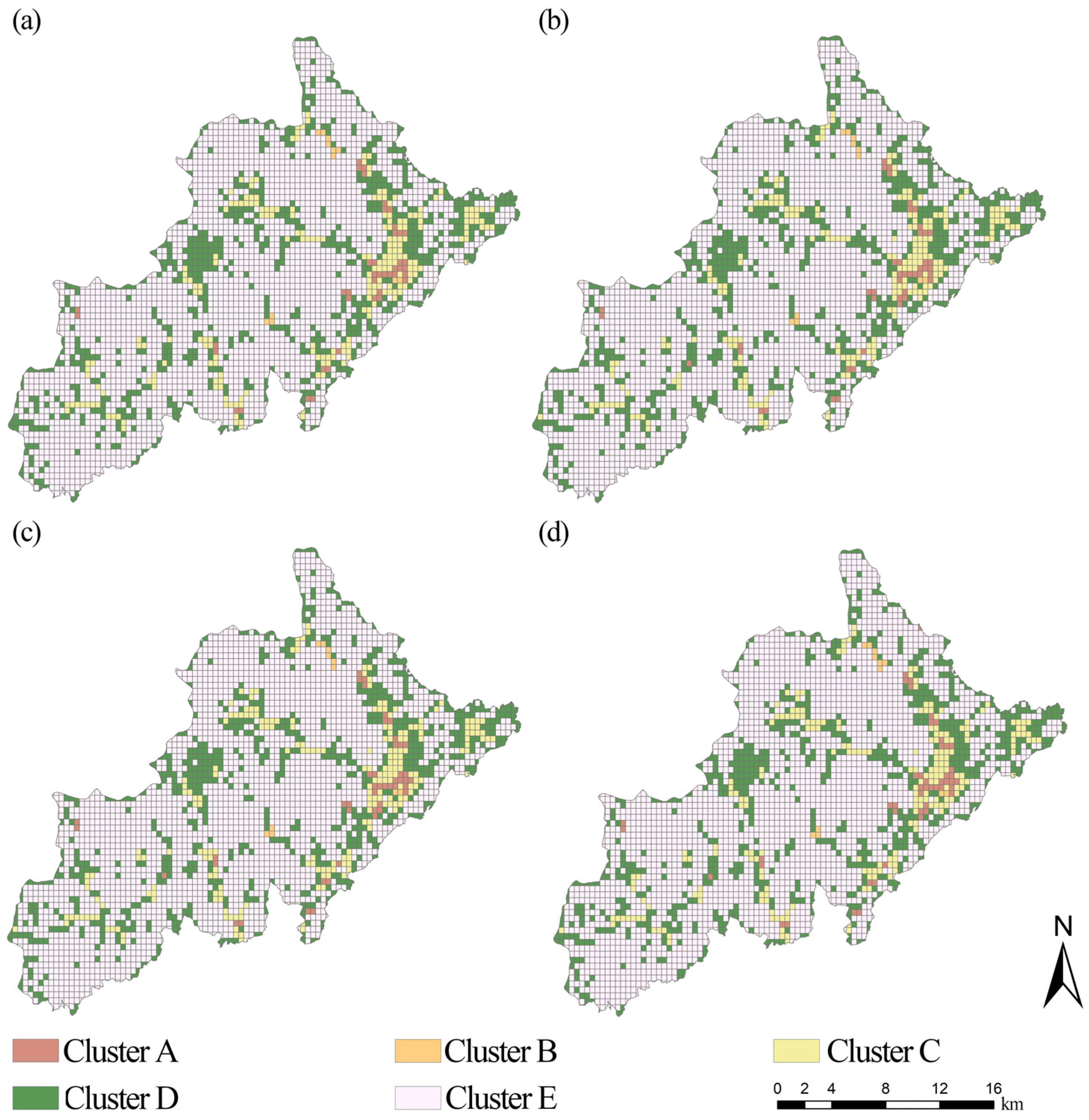 | The Ecological–Industrial Transition and Optimization Zone | Cluster D | The area comprises land-use types such as dryland and grassland and is located within the transitional zone between Cluster C and Cluster E. It faces dual demands for ecological conservation and industrial development. On the one hand, it is essential to strictly uphold the ecological red line, strengthen the protection of dryland and grassland ecosystems, and prevent ecological degradation resulting from overexploitation. On the other hand, the area’s ecological functions can be appropriately harnessed to regulate the local environment and support sustainable industrial development. |