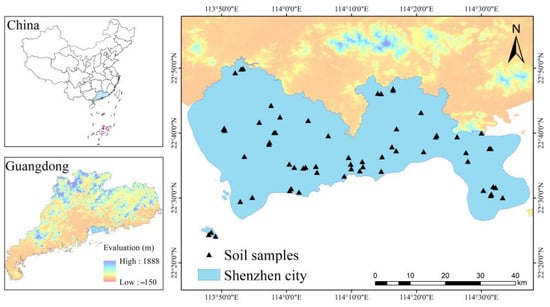 Shenzhen City is located on the southern coast of Guangdong Province, south of the Tropic of Cancer (114°37′21″ E, 22°26′59″ N). This region is among the most developed and urbanized in China. The study area had a typical subtropical maritime climate, characterized by an annual average temperature of 23.2 °C and abundant rainfall, with annual precipitation averaging 1932.9 mm. Its topography was diverse and dominated by low mountains and hills, succeeded by terraces and coastal plains. The highest peak within the region, Wutong Mountain, reached an elevation of 944 m. The soil profile consisted of 10 major soil types and 15 subtypes, including lateritic, yellow, red, and coastal sandy soils. The primary parent materials for soil formation were granite and sandy shale. Osmanthus soil was distributed in hilly and sloping areas at elevations below 300 m. Red soil predominantly occupied the middle to upper sections of mountains ranging from 300 to 600 m in elevation, while yellow soil primarily occurred in the middle to upper reaches of low mountains exceeding 600 m in elevation. The zonal vegetation consisted of coastal subtropical monsoon evergreen broad-leaved forests (Figure 1).