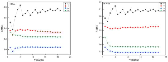 To ensure model accuracy and efficiency, the number of independent variables was selected based on the criterion of achieving the lowest RMSE. After screening (Figure 2), the final feature variable counts used for modeling VAC, AC, PAC, and IAC in the 0–10 cm soil layer were 2, 2, 2, and 5, respectively. To model VAC, AC, PAC, and IAC in the 10–30 cm soil layer, the feature variable counts were 2, 3, 5, and 5, respectively. These results show that core soil properties have significant correlation with carbon fractions, which lays a foundation for further verifying their causal roles through subsequent PLS-SEM analysis.