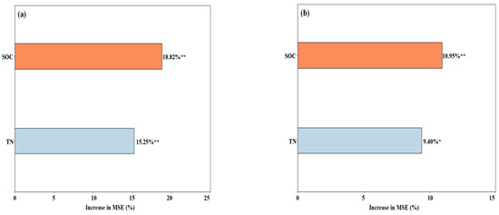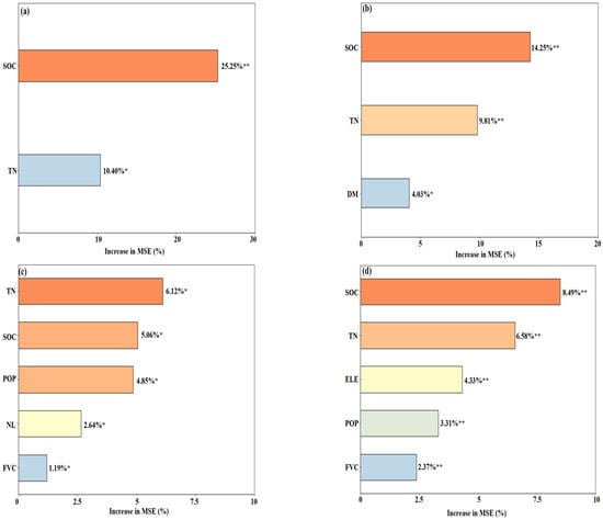 Relative Importance of Environmental Factors in the 0–10 cm Soil Layer. Note: Panels (a–d) represent the relative importance of environmental factors on VAC, AC, PAC, and IAC, respectively, in the 0–10 cm soil layer. p-values are: * p < 0.05; ** p < 0.01.