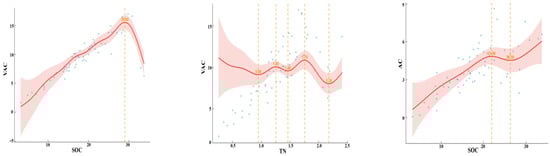 GAMs are nonparametric statistical analysis methods based on generalized linear and additive model principles. This model can objectively express both linear and nonlinear relationships between explanatory and response variables [26]. For each carbon fraction, the key factors identified by RF-RFE were used as predictors. Model fitting goodness was evaluated by adjusted R2, and threshold points were determined by identifying inflection points in the smooth curves.